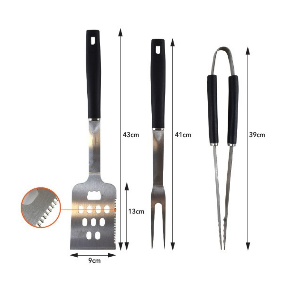 Το ανοξείδωτο σετ BBQ 3 εργαλείων αποτελεί μια κορυφαία επιλογή για κάθε λάτρη του ψησίματος που θέλει να απολαμβάνει επαγγελματικά αποτελέσματα με μέγιστη άνεση και ασφάλεια. Το σετ περιλαμβάνει τα βασικά αλλά απαραίτητα εργαλεία: πιρούνα, σπάτουλα και λαβίδα, όλα κατασκευασμένα από υψηλής ποιότητας ανοξείδωτο ατσάλι (Inox), που εγγυάται ανθεκτικότητα και μακροχρόνια χρήση.