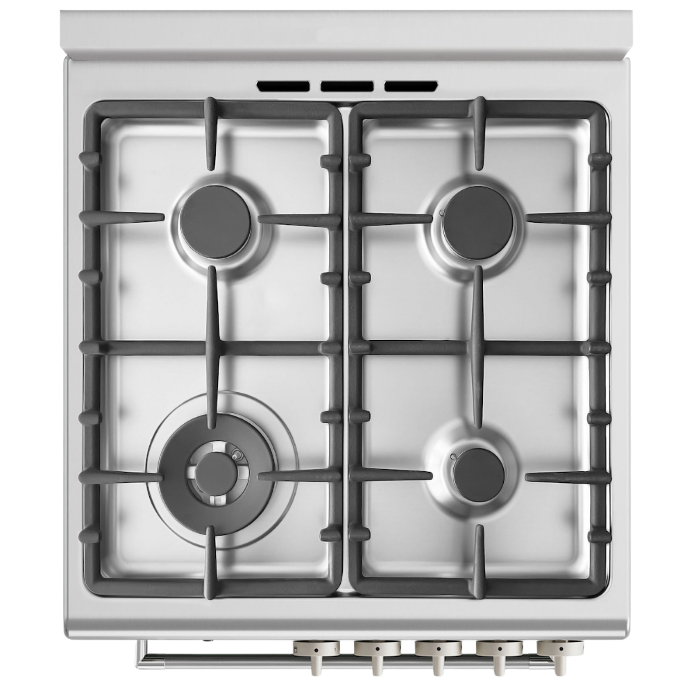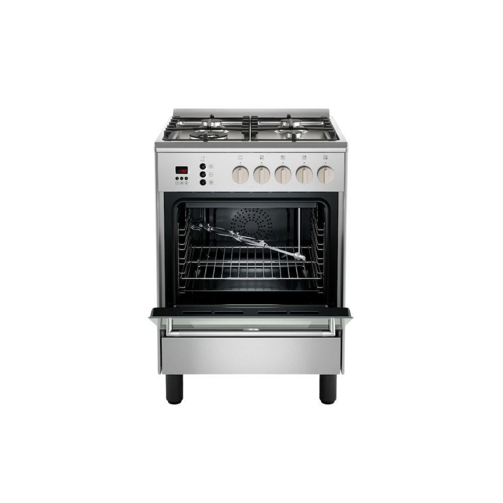 Κουζίνα 60×60εκ. με 4 εστίες αερίου και φούρνο αερίου με αέρα. Διαθέτει 1 καυστήρα διπλής φλόγας WOK και 3 εστίες αερίου με σχάρες χυτοσιδήρου. Ο φούρνος αερίου προσφέρει λειτουργίες MultiGAS και σούβλα grill. Περιλαμβάνει ενεργοποίηση φωτισμού LED, ρολόι και χρονοειδοποιητή, με πλάτος 60εκ. και ενεργειακή σήμανση.