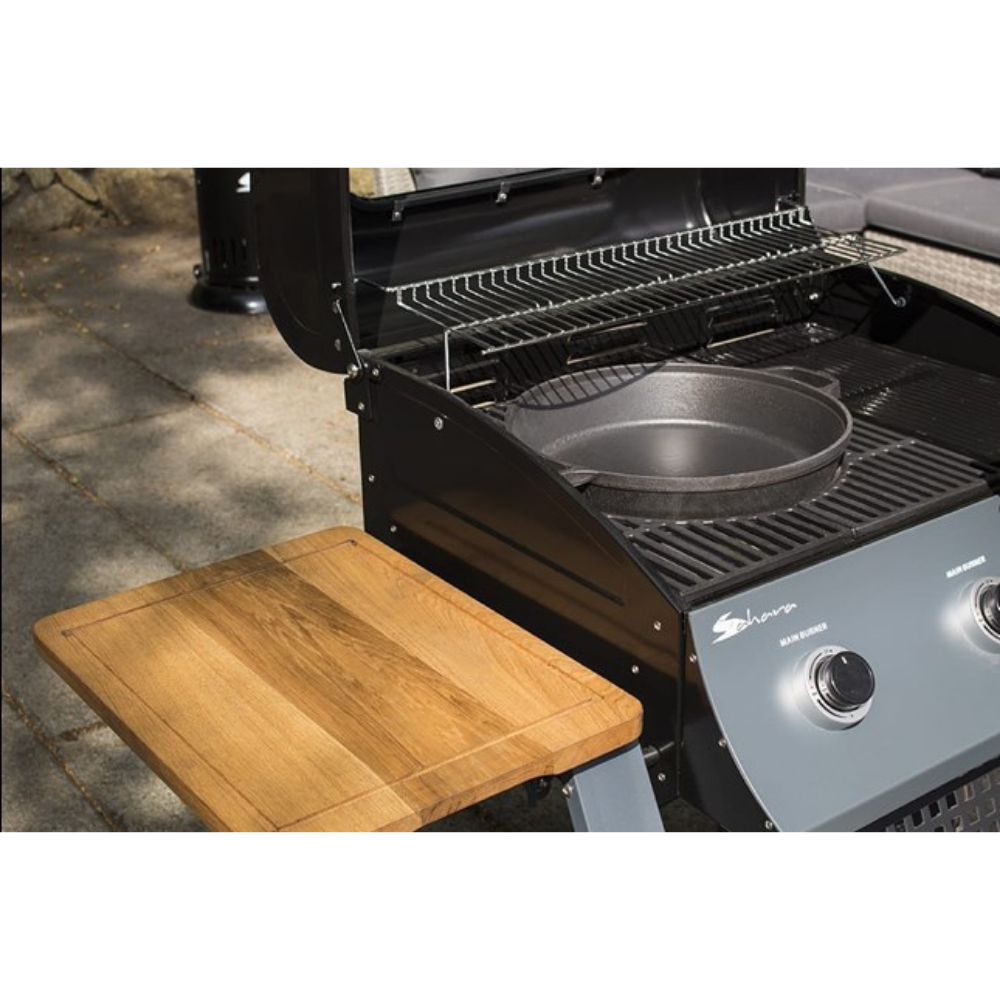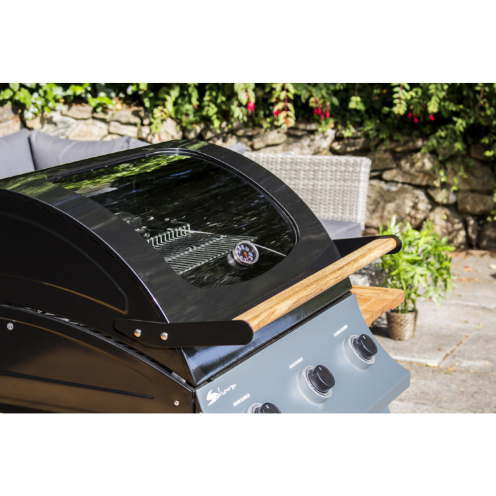 Ένα υψηλής ποιότητας μπάρμπεκιου υγραερίου με 3 καυστήρες από ανοξείδωτο ατσάλι και 2 πλαινούς αποσπώμενους δίκους από γερμανική δρυ.