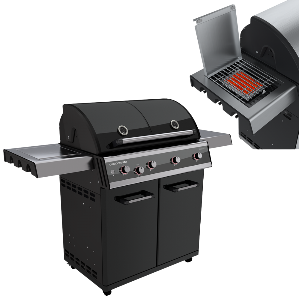 Επιπλέον, τα μοντέλα OUTDOORCHEF DUALCHEF διαθέτουν HEAT DIFFUSER, ο οποίος κατευθύνει τη θερμότητα στο περιστρεφόμενο καλάθι (δεν περιλαμβάνεται στο πακέτο) και έτσι μειώνει την κατανάλωση αερίου. Ταυτόχρονα, η συγκεντρωμένη θερμότητα εξασφαλίζει μια ωραία κρούστα στο κρέας ή στο ψητό κοτόπουλο. Το ΣΥΣΤΗΜΑ ΦΩΤΩΝ ΑΣΦΑΛΕΙΑΣ (SLS) στα περιστροφικά χειριστήρια ενεργοποιείται μόλις ανοίξει η βαλβίδα. Ο αισθητήρας φωτός προσαρμόζει αυτόματα την ένταση των φώτων LED στη φωτεινότητα του περιβάλλοντος. Τα στιβαρά, αναδιπλούμενα πλαϊνά ράφια προσφέρουν αρκετό χώρο για την προετοιμασία γευμάτων.