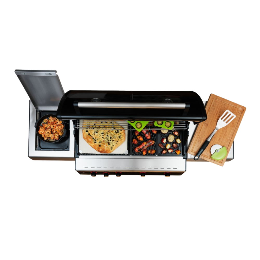Η εμπειρία του μπάρμπεκιου ολοκληρώνεται με αξεσουάρ ειδικά σχεδιασμένα για το DUAL GOURMET SYSTEM, όπως το περιστρεφόμενο σετ σούβλας-καλαθιού, η μαντεμένια πλάκα, η σχάρα ψησταριάς από ανοξείδωτο χάλυβα και το σετ μαγειρέματος. Με την πέτρα πίτσας, ένα πλαίσιο από ανοξείδωτο χάλυβα αυξάνει τη θέση ψησίματος, γεγονός που επιτυγχάνει βέλτιστο συνδυασμό θερμότητας πάνω και κάτω – και ιδιαίτερα τραγανά αποτελέσματα. Προστέθηκε επίσης το χυτό πιάτο plancha, το οποίο προσφέρει άφθονο χώρο για ψητά. Διαθέτει μια πρακτική αυλάκωση χυμού για την αποστράγγιση του περιττού λίπους, καθώς και μια μικρή επιφάνεια ψησίματος με ραβδώσεις στο μπροστινό μέρος και μια αφαιρούμενη ζώνη θέρμανσης από ανοξείδωτο χάλυβα.