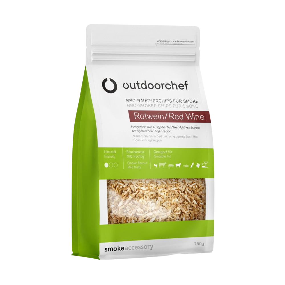 Δώστε στα φαγητά σας την πολυτέλεια ενός μοναδικού αρώματος! Τα τσιπς ξύλου καπνίσματος με άρωμα κόκκινου κρασιού της Outdoorchef προσφέρουν φυσικό καπνό, πλούσια γεύση και αρωματικό βάθος στο ψήσιμο, ιδανικά για κρέας, ψάρι ή λαχανικά. Διαθέτουν πιστοποίηση FSC.